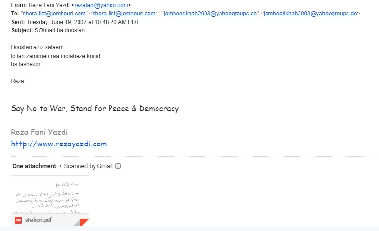 این نامه را من در اعترا ض به مخالفت تعدادی از اعضای هیئت سیاسی اجرایی دررابطه با دستگیری علی شاکری پس از اینکه دو بار موضوع در جلسه مطرح شد و مورد مخالفت قرار گرفت در تاریخ ۱۹ ماه جون در سال ۲۰۰۷ نوشتم. در هر دو جلسه امیر حسین گنج بخش تحت این عنوان که ما یک سازمان سیاسی بوده و نه یک نهاد حقوق بشری با نوشتن بیانیه ای در اعتراض به دستگیری او و تلاش برای آزادی او مخالفت کرد. در زیر متن این نامه را گذاشته ام.