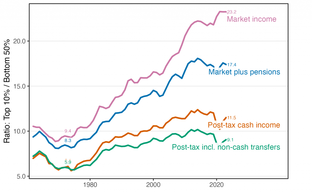 درآمد پس از مالیات دهک بالایی تنها ده برابر درآمد نیمهٔ پایین است، در حالی که پیش از مالیات بیستوسه برابر بود.