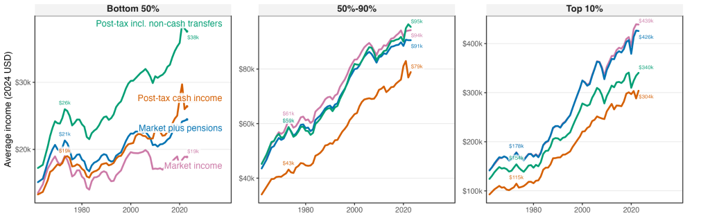 در مقابل، شکل ۱ نشان میدهد که تقریباً تمام رشد درآمد پس از مالیات در میان طبقات پایین، ناشی از افزایش ارزش انتقالات غیرنقدی (noncash transfers) بوده است، بخش عمدهای از این انتقالات به شکل برنامههای درمانی Medicaid و Medicare پرداخت میشود.