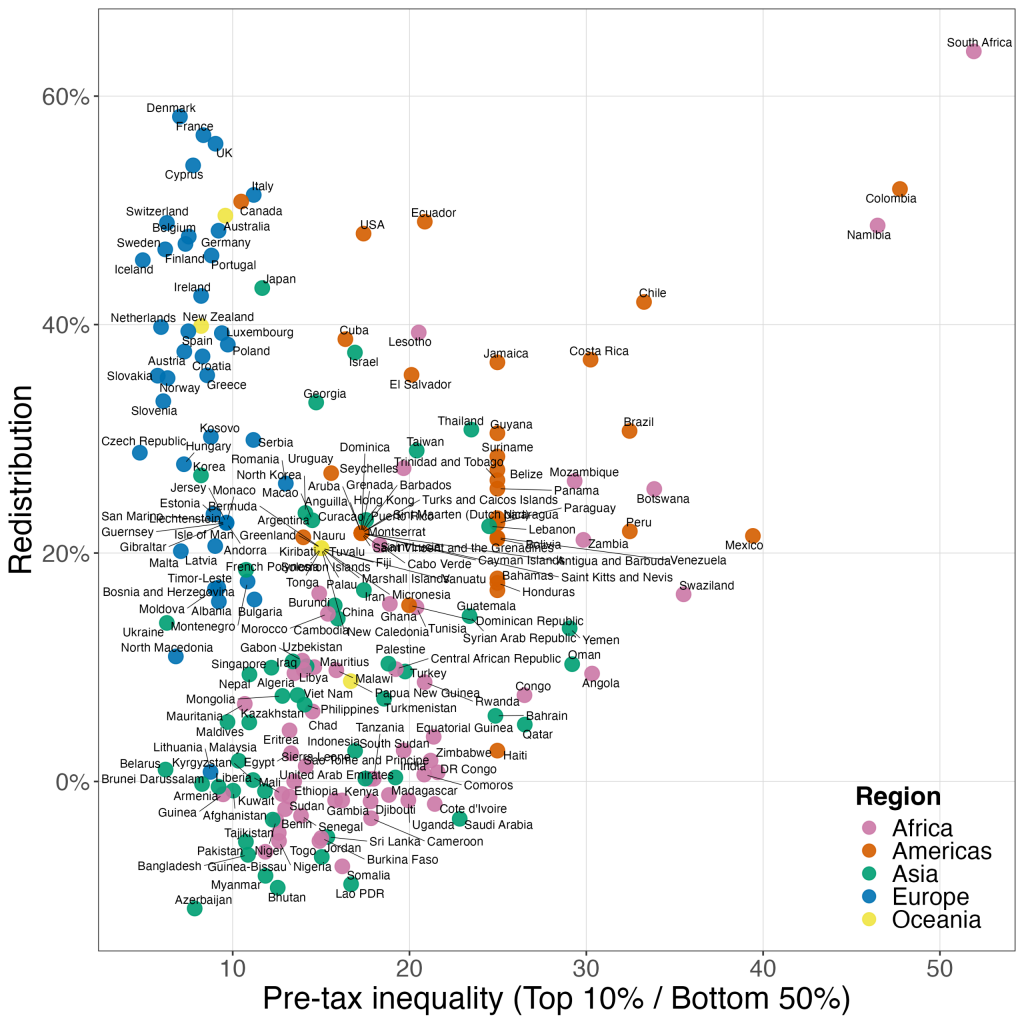 کشورهایی که در بخش بالایی نمودار هستند، بازتوزیع بیشتری انجام میدهند — یعنی سیاستهایشان موجب فشردهتر شدن توزیع درآمد پیش از مالیات میشود.