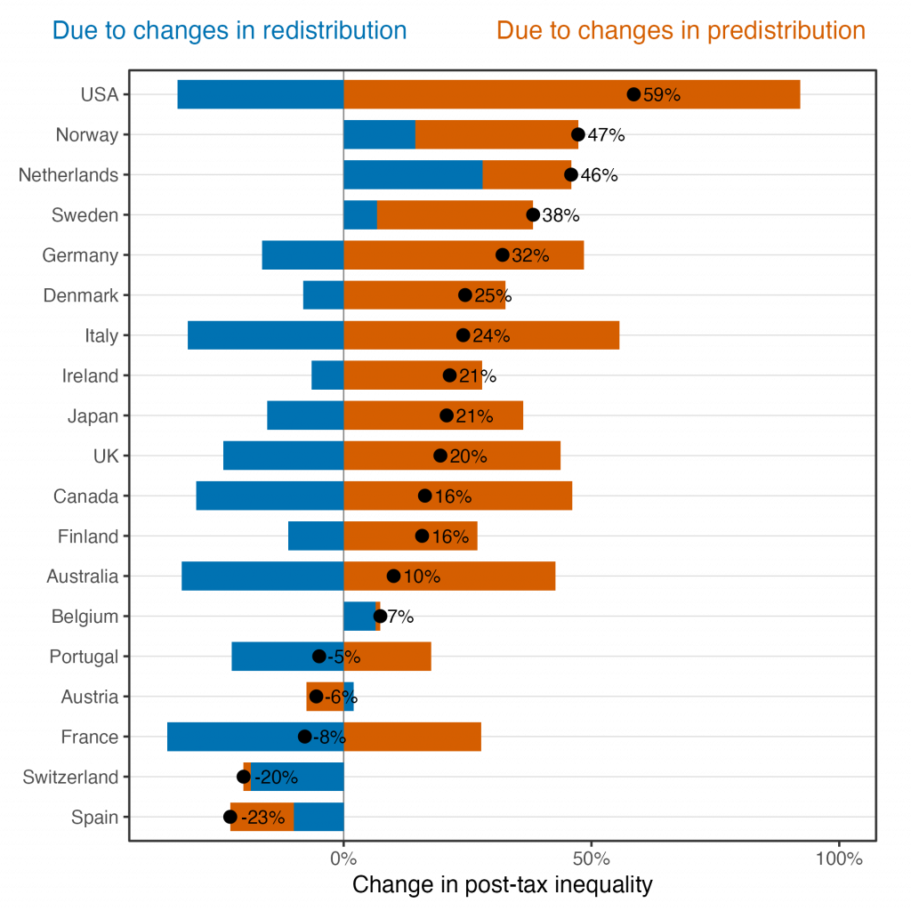 در برخی کشورها این افزایش تا حدی با بازتوزیع بیشتر جبران شده، اما تنها پرتغال و فرانسه توانستهاند بهطور کامل اثر افزایش نابرابری پیش از مالیات را خنثی کنند. در حالی که در اسپانیا، اتریش و تا حدودی سوئیس، نابرابری پیش از مالیات حتی کاهش یافته است.