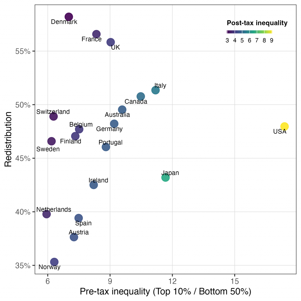 دارای نابرابری پیش از مالیات پایین هستند، اما بازتوزیع نسبتاً کمی انجام میدهند. - در مقابل، کشورهایی چون دانمارک، فرانسه و بریتانیا